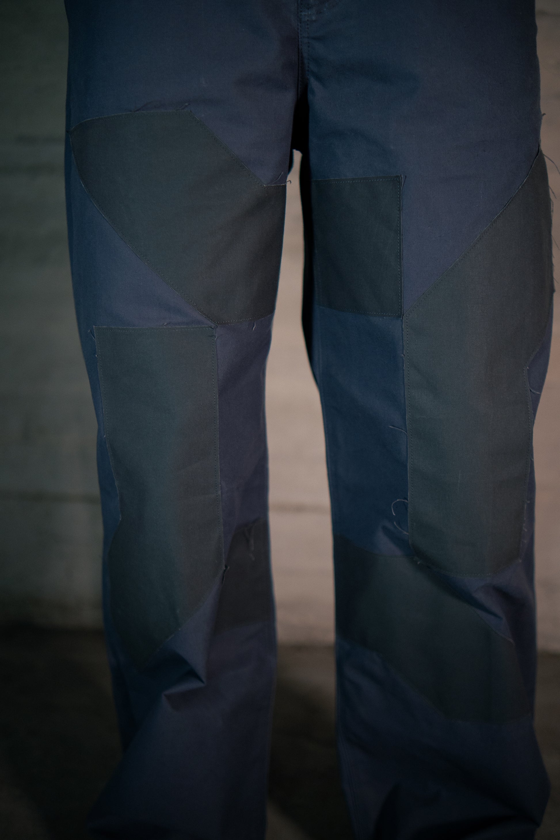 These jeans have been made from deadstock premium tent fabric. It features mulitple pockets, a zipper closure and belt loops around the waist.
